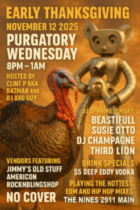 Purgatory Wednesday Hosted byClint P aka BatmanDJ Bag Guy FeaturingBeastifullSusie OttoDJ ChampagneThird Lion Playing the hottest EDM and Hip Hop Mixes Plus VendorsJimmy’s Old StuffAmericonRocknblingshop No Cover All Night21+