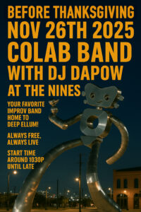 The Night Before Thanksgiving Colab BandWith DJ Dapow Your Favorite Improv BandHope to Deep Ellum Always Free, Always Live Doors at 8. show at 10:30 No Cover All Night21+