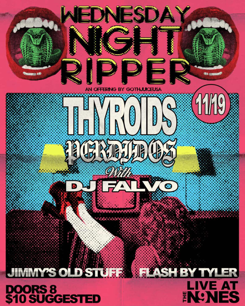 Wednesday Night Ripper Wednesday, November 19, 2025 9PM-1AM Presented by:Gothjuiceusa Live performances:ThyroidsPerdidos Sounds by:DJ Falvo Pop-up shops:Jimmy’s Old Stuff Flash by:Tyler Food:Burrito Bandits 21+ | Doors at 8pm | $10 suggested Flyer by:Online Shoplifter