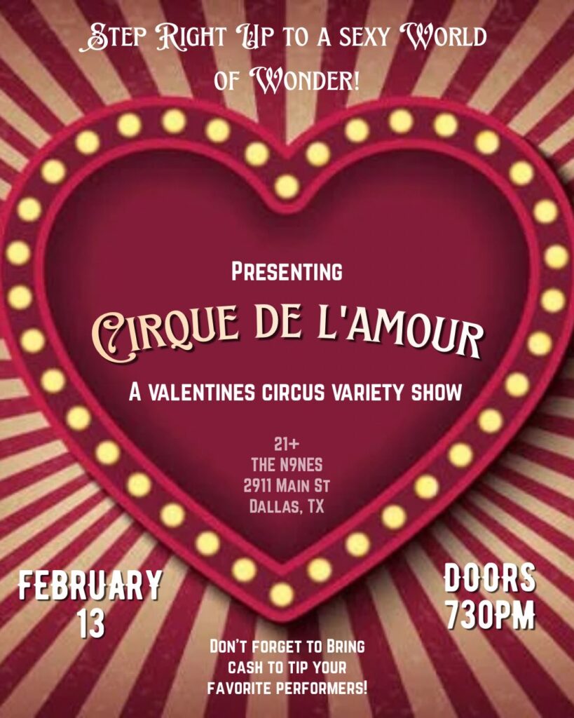 Welcome to our first ever “Cirque De L’Amour” at The N9nes – February 13, 2026 at doors at 7:30, show at 8pm! Come kick off your valentines weekend with us! Step on up for a sexy variety of circus, burlesque, magic and more. Don’t miss out on this chance to support some great local artists! Make sure you have CASH IN HAND to tip your favorite perfomers! #dfwnightlife