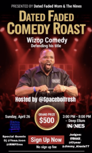 Dated Faded Sundays x The Nines presents..Dated Faded Comedy Roast Sunday, April 26th 3-8pm 📍The Nines – 2911 Main Street, Dallas Texas $500 Cash Price for 1st place! Sign up Now for your Chance to Try and Take @wizopcomedyDM @DatedFadedWorn to participate Host: @SpaceBoiFreshJudges: @Bmacjr_@Jimmy_Alexis77@CiyearSpecial Guests DJ: @yeaa.toon @irmfilms #DatedFadedRoast